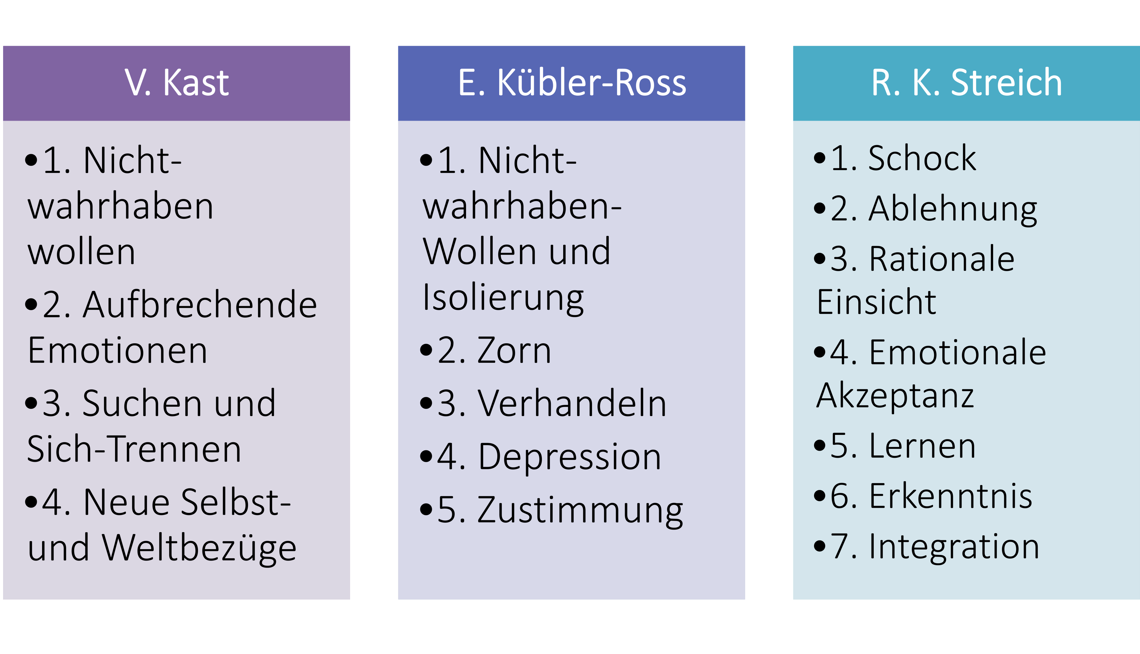 [1] Kast, V. (1982). Trauern. Phasen und Chancen des psychischen Prozesses. Kreuz, Stuttgart.