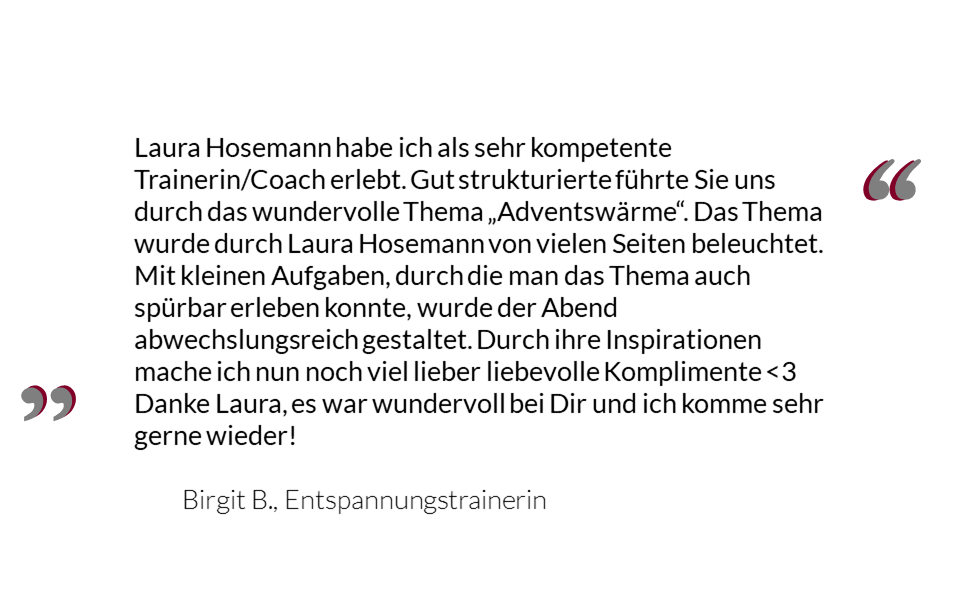 Ich konzipiere und führe Workshops und Trainings zu Themen der Lebenskunst und ressourcenorientierten Problemlösung durch. Zurzeit arbeite ich beispielsweise an Workshops zu „Wertschätzenden Kommunikation“ oder „Lebensvisionen gestalten„. Fragen Sie auch nach einem individuell angepassten Angebot für Ihr Unternehmen!