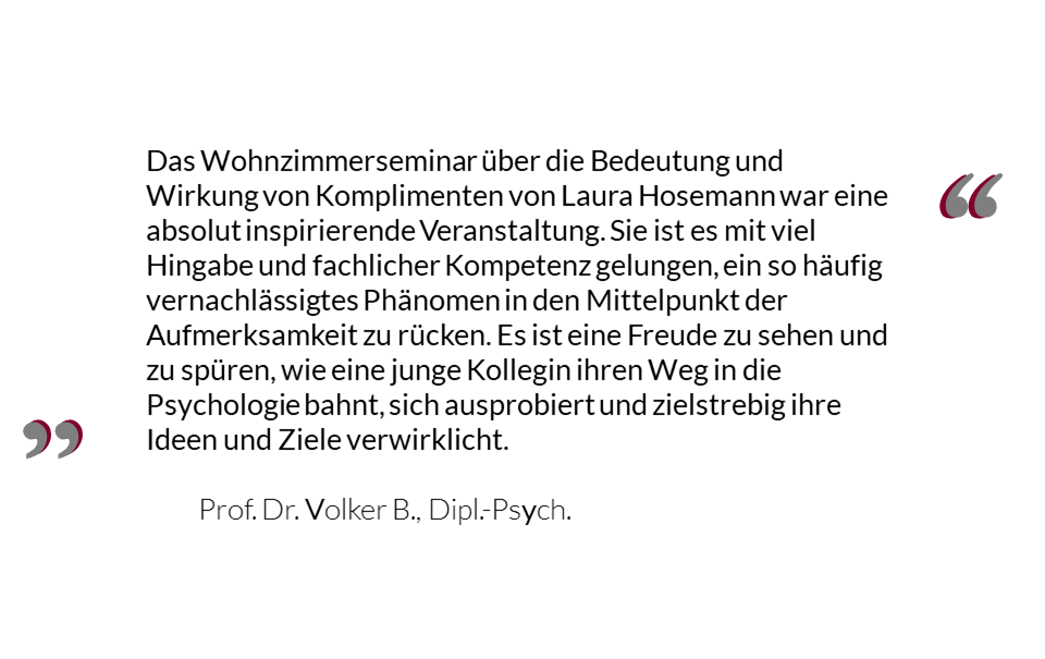 Eine psychologische Beratung ersetzt keine verschriebene Psychotherapie und die hier angebotene Beratung stellt keine Psychotherapie im Sinne des Psychotherapeutengesetzes dar. Warten Sie bei akuten, seelischen Notlagen nicht auf einen Beratungstermin! Hier kann die TelefonSeelsorge in Deutschland hilfreich sein. Sie erreichen Sie unter +49 (0)800 111 0 111 (gebührenfrei). In dringenden Krisen- oder Notsituationen, z.B. wenn sie akut Selbstmordgedanken und/oder –Handlungen erleben, wenden Sie sich umgehend an Ihren Arzt, die für Sie zuständige psychiatrische Klinik oder an den Notdienst unter 112 (ggf. 110).